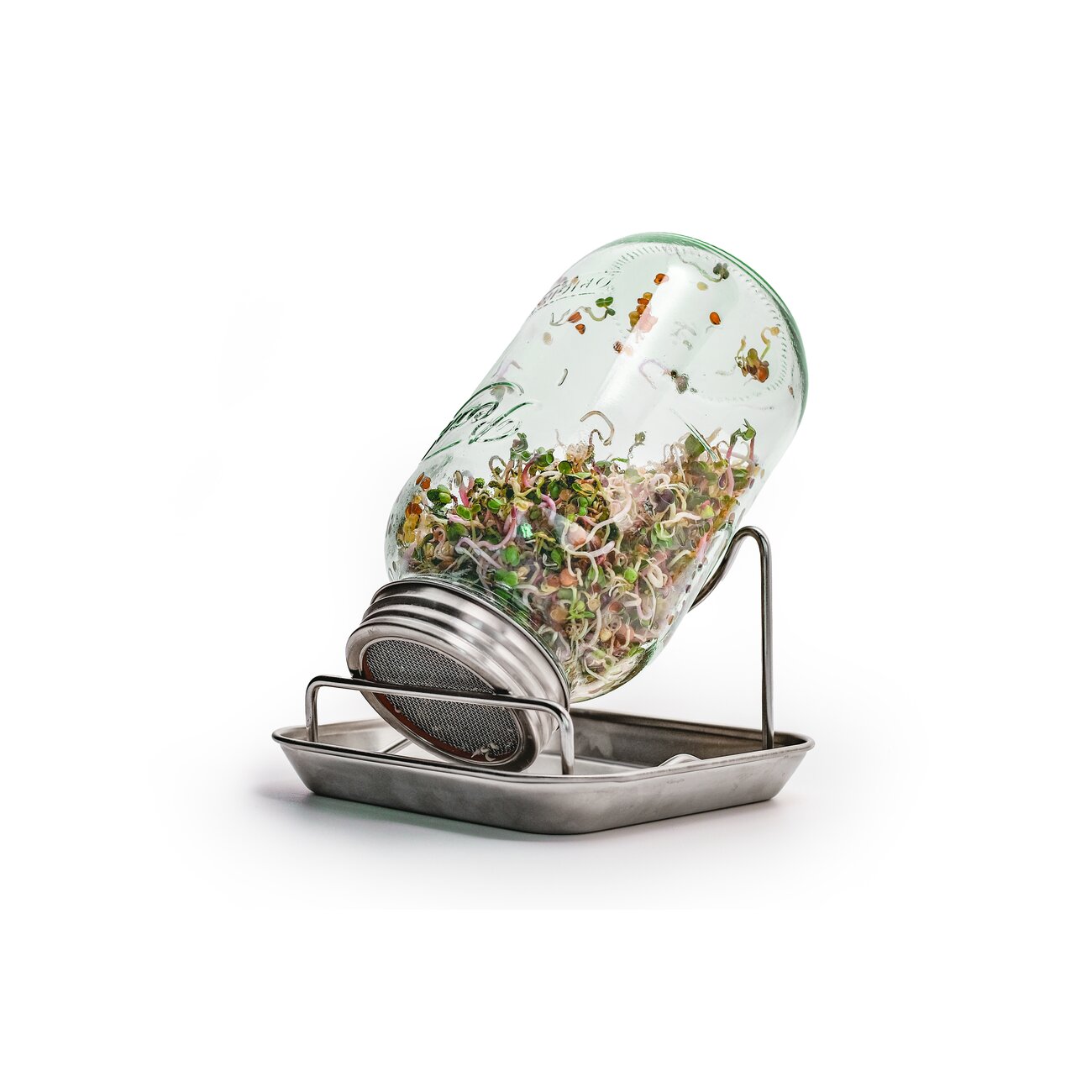 All parts of the set are easy to clean and dishwasher safe, although the sealing rings should only be washed at low temperatures. The metal parts are made of stainless steel. You can find growing tips for sprouts in the friend book that comes with the sprouting glass.
