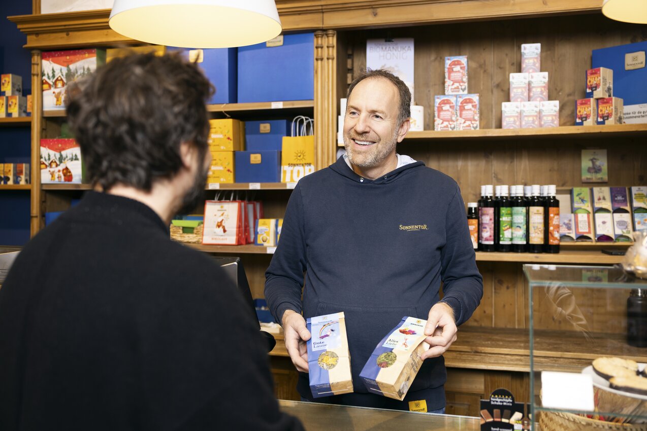 The delightful interior of the shop, where modern design meets traditional elements, is home to the entire SONNENTOR product range - from our organic tea specialties and a large variety of spices to our Cheeky Cherubs products for children, Hildegard products and creative gift ideas!